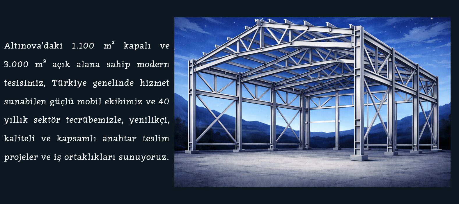 Tesislerinizin çatı sistemleri ve çelik platformlarına ergonomik çözümler kazandırıyoruz. Yapılarınızın dayanıklılığını artırırken, işlevsellik ve ergonomiyi bir arada sunarak verimli çalışma alanları oluşturuyoruz. Çelik konstrüksiyonlar ve kaliteli malzemelerle inşa edilen tesis yapıları, güvenliği ve iş gücü verimliliğini en üst düzeye çıkarmaktadır.